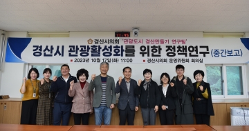경산시의회 의원연구단체 '관광도시 경산만들기 연구팀'(대표자 박미옥)은 10월 17일 의회 운영위원회실에서 '경산시 관광 활성화를 위한 정책연구'를 주제로 중간보고회를 개최했다.