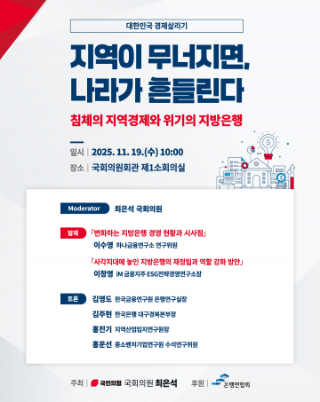 11월 19일(수) 오전 10시 국회의원회관 제1소회의실에서는 최은석 의원실 주최로 「지역이 무너지면, 나라가 흔들린다: 침체의 지역경제와 위기의 지방은행」이 개최된다. 토론회에서는 지역경제 쇠퇴로 위기에 놓인 지방은행의 경영 현황을 진단하고 역할 강화 방안을 모색한다.