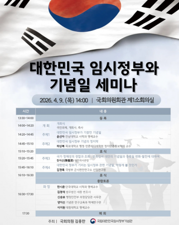 4월 9일(목) 오후 2시 국회의원회관 제1소회의실에서는 김용만 의원실 주최로 「대한민국 임시정부와 기념일 세미나」가 개최된다. 세미나에서는 대한민국 임시정부가 기렸던 기념일과 기념의 정치학을 바탕으로 현재의 대한민국 정부가 기리는 임시정부 관련 기념일을 진단한다.