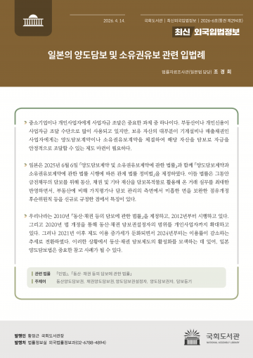 국회도서관(관장 황정근)은 4월 14일 ‘일본의 양도담보 및 소유권유보 관련 입법례’를 주제로 『최신외국입법정보』 2026-6호(통권 제294호)를 발간했다.